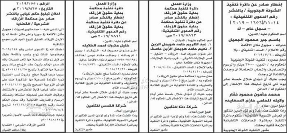 الاثنين أحكام قضائية وإخطارات عن دوائر التنفيذ ومذكرات تبليغ مواعيد جلسات أسماء